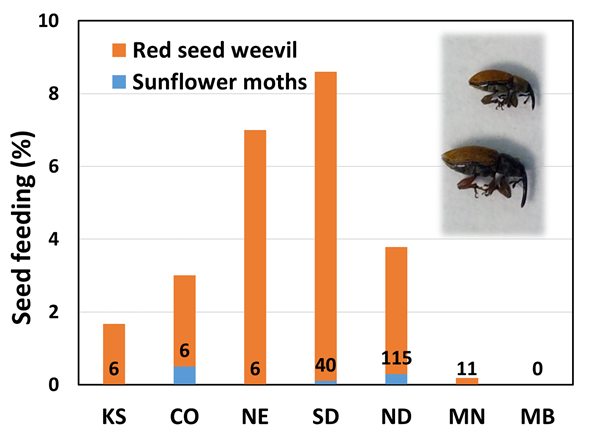 Below: This schematic illustrates percentage of seed feeding by the red seed weevil and sunflower moth in analyzed samples in the 2025 sunflower crop survey. The numbers at the bottom of the bars represent the number of fields sampled for these two insects in each state.