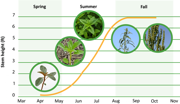 The seasonal lifecycle of a waterhemp plant, approximate in Illinois.