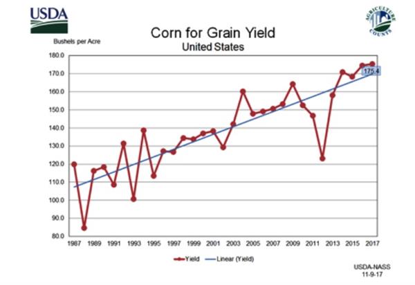 The chart below is the corn yield history. It’s been a good run of above- trend corn yields.