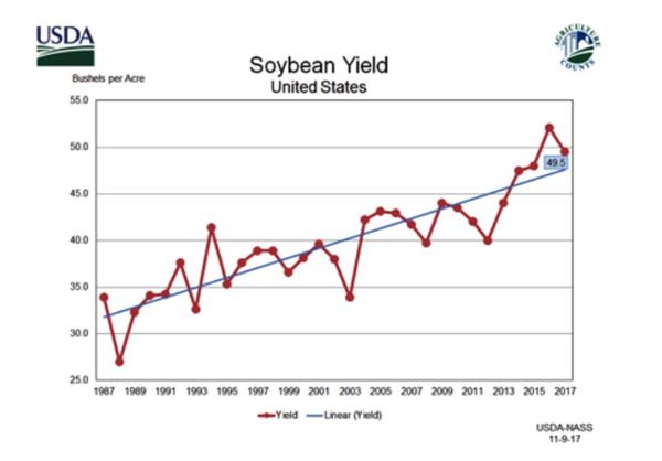 The chart below shows the U.S. soybean yield history. It has also been impressive the last four years.
