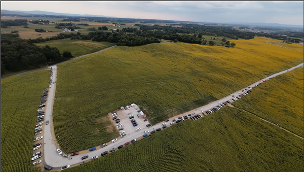 Cars line the road, bringing visitors to the sunflower fields at Lesher Poultry Farm, located near Chambersburg in south central Pennsylvania.